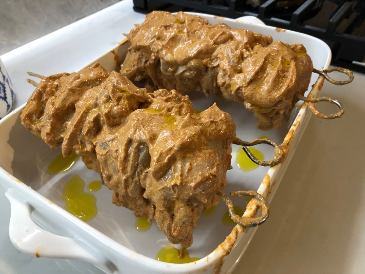 - Prop each of the 2 skewers on the edges of the pan. Drizzle with olive oil.