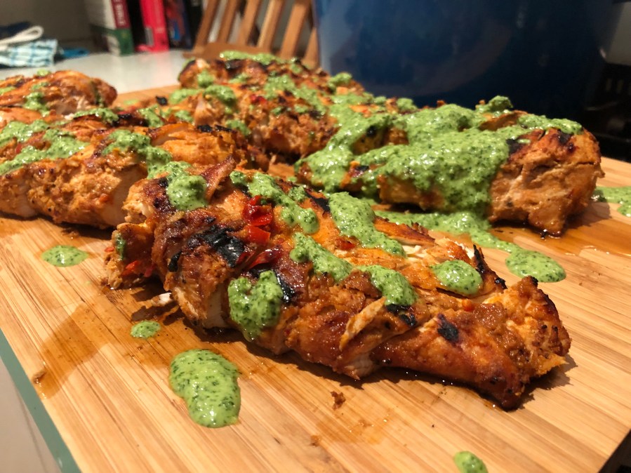 - Serve with… we didn’t continue with the Peruvian theme here with air fried Brussel Sprouts and hand-cut potato wedges cooked with chilli flakes, though anything will go. The chicken and the Green Sauce are your hero.