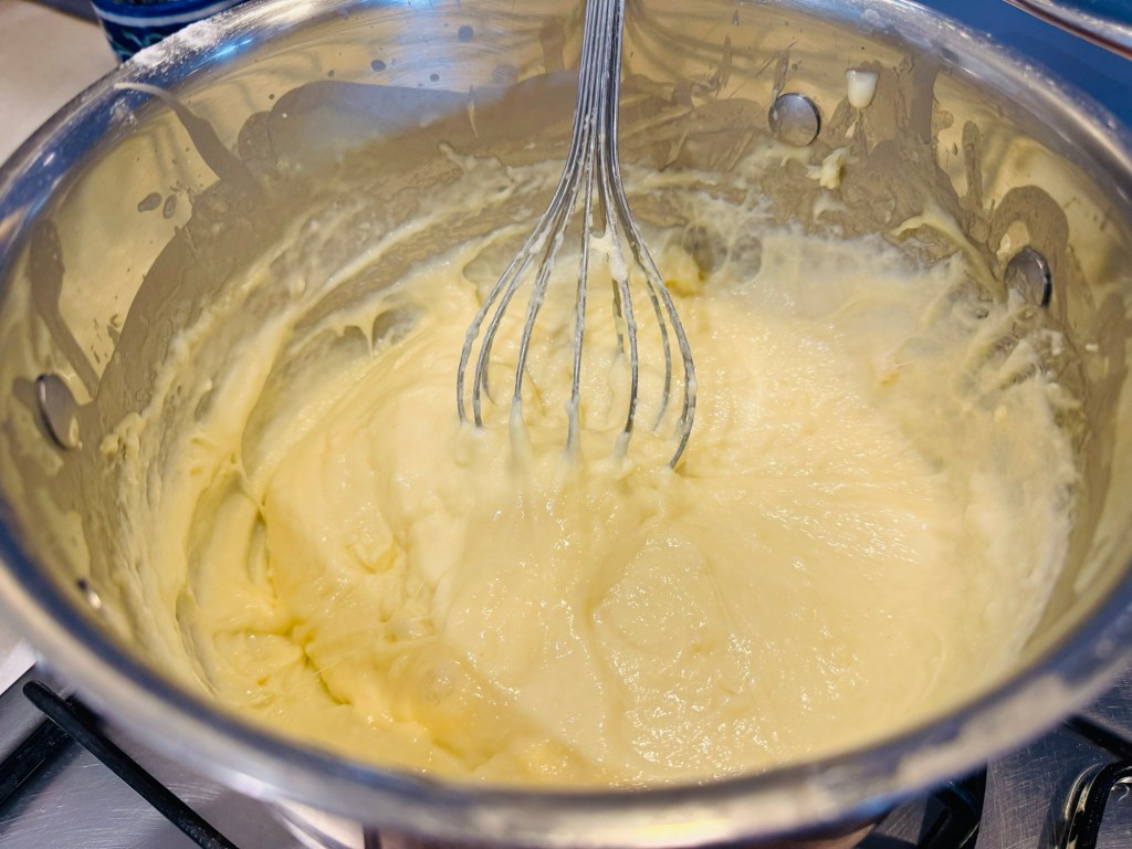 9. Add butter, cream, garlic powder, salt and pepper. Stir all ingredients together.