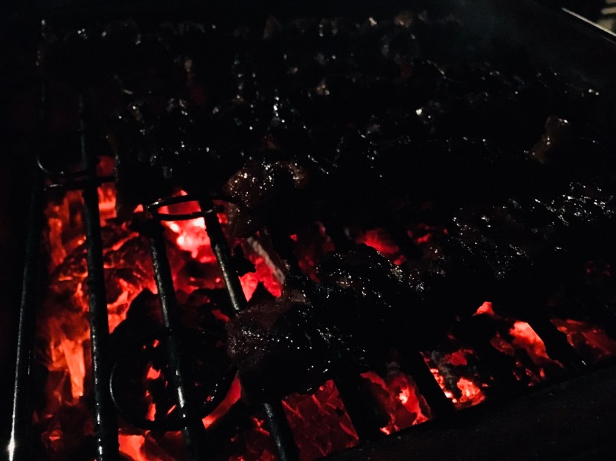 The idea was inspired by some Phillipino pork skewers we had cooked over a traditional hibachi grill at a market a few weeks prior; though a sensible, all-in-one charcoal grill versus a not so sensible, not so portable hibachi grill steered us in the Heston direction.